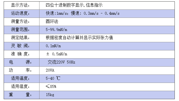 仪器符合GB/T6541的标准,采用圆环法在非平衡的条件下测量各种液体表面张力(液—气相界面)及矿物油与水的界面张力(液—液相界面)。该仪器采用了微处理技术,自动化程度高、操作简便、工作可靠。被测样品注入杯后,只要按动启动键,仪器便可自动完成对试样的测量,并能自动根据输入的具体参数计算出被测试样的张力值。